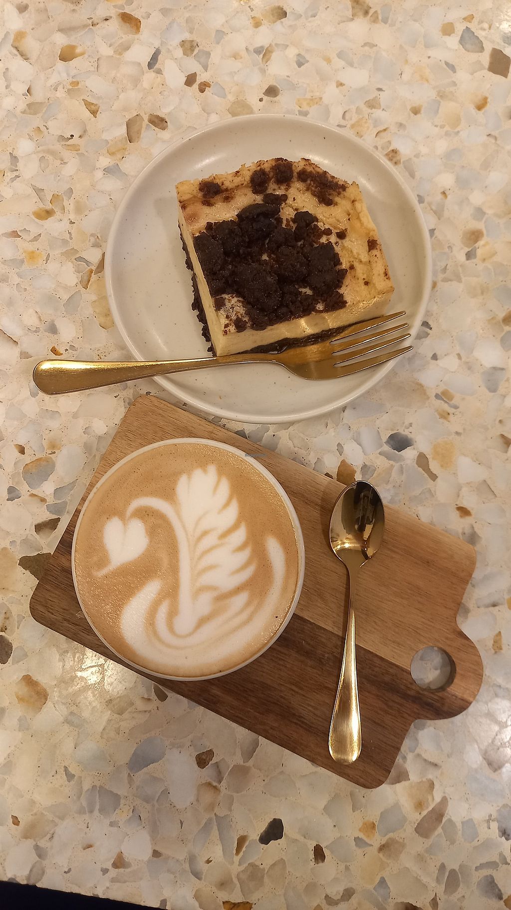 I enjoyed a piece of vegan cake and an oat cappuccino, both very tasty! The atmosphere was nice, for me a bit too fancy and less cozy though.