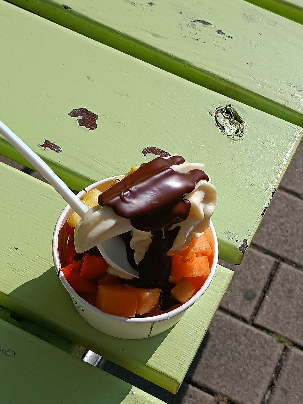 I got a medium pint of their frozen soy yoghurt. Sadly, they only had one vegan sauce in stock, the dark chocolate sauce. I didn't really like the combination of slightly sour yoghurt and sweet chocolate and the person who served me, hasn't really mastered the assembling yet, but the fruit toppings where fresh and the vegan Froyo just as good as I remember from their other stores. Worth it :)