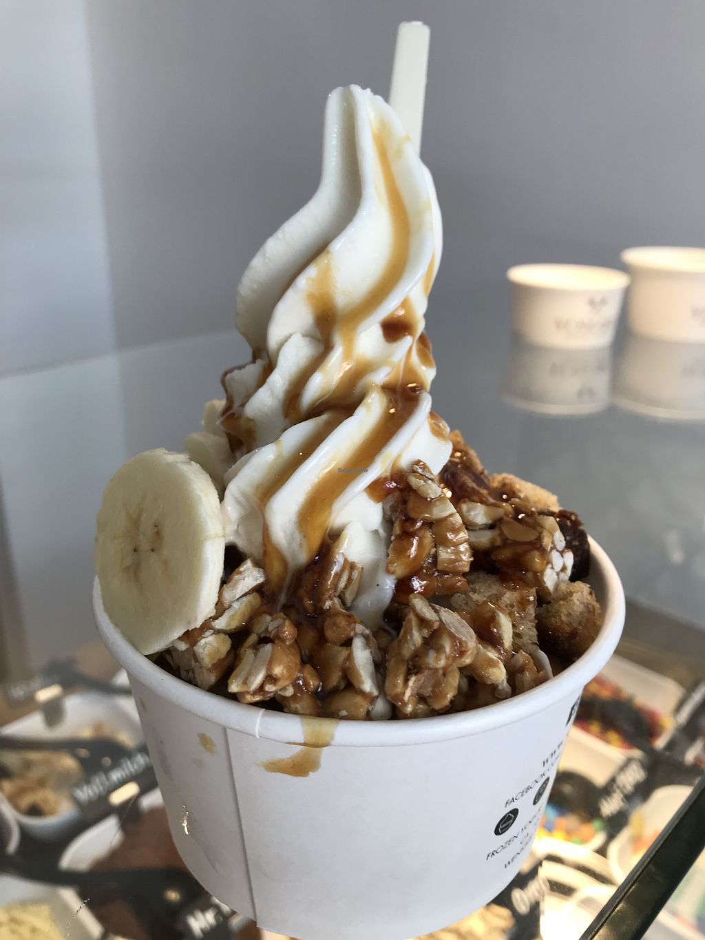 Vegan Froyo with banana, mr.tom, bananabread and caramelsauce size med…