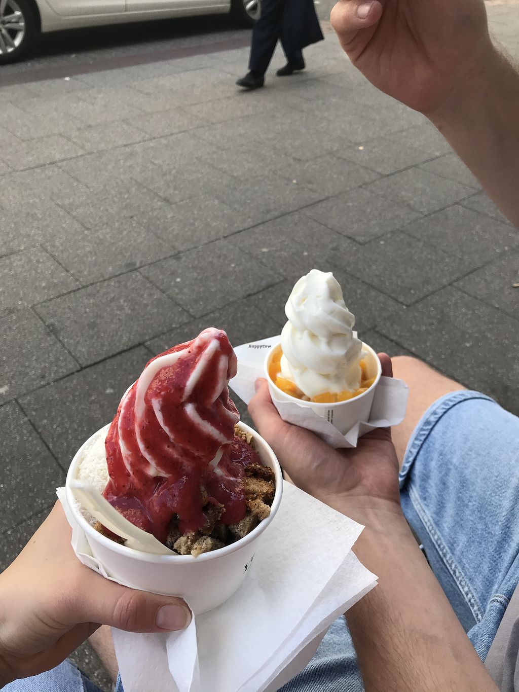Two really delicious vegan frozen yoghurts! Left: caramel sauce, pinea…