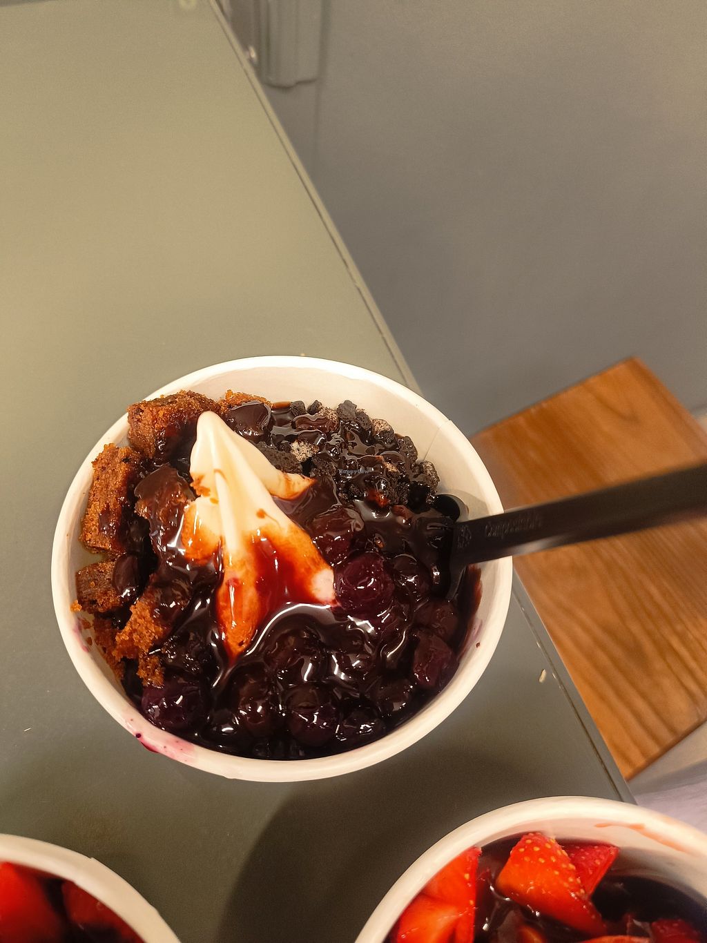 XS veganer Froyo mit veganem Karottenkuchen, Heidelbeeren, Schokolade …