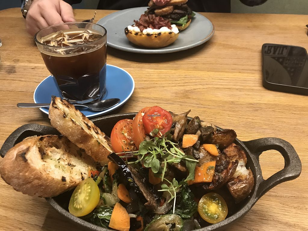 Brunch skillet made vegan, iced americano, vegan butty in the backgrou…
