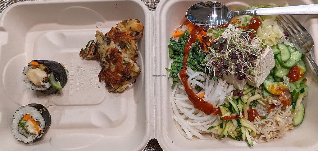 We enjoyed bibimbap (rice) and bibim noodles. A rare treat, they have v mung bean pancakes! Gim bop (Korean version of sushi) was most excellent. Also they had a fresh bar of sides and the staff were knowledgeable about which were vegan. The only minus points were no v kimchi and no v mandu (dumplings).