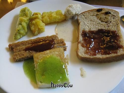 Tempura, wholemeal bread, beancurd with kiwi sauce, bean steak.