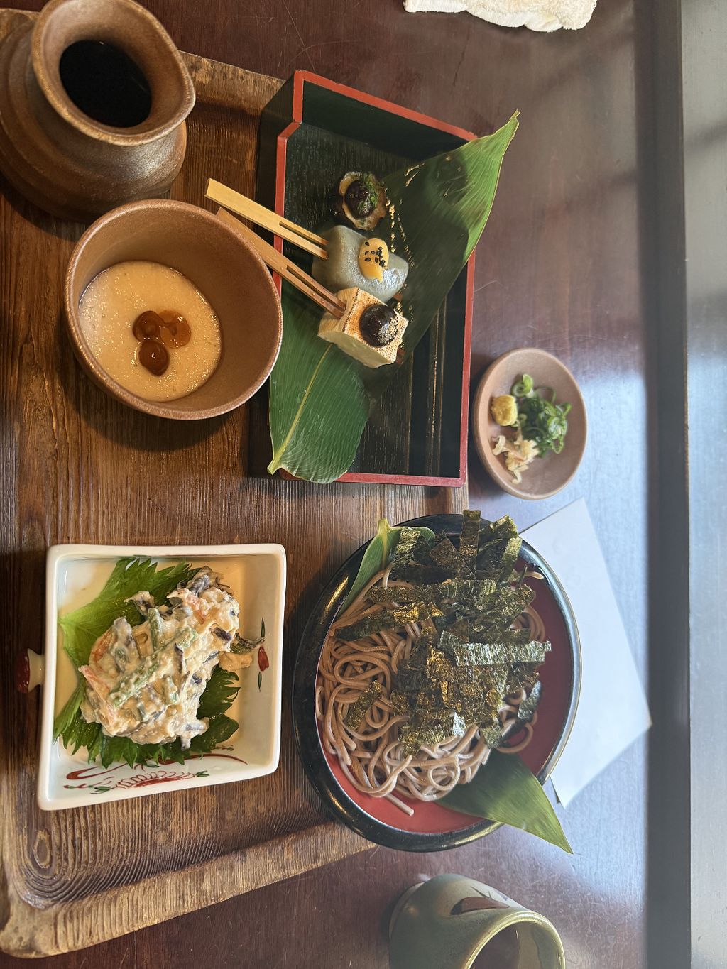 So glad we heard about this place in lonely planet. This is temple food, which is traditional Buddhist fare - vegan, no garlic, onion or oil. We had to make the most of this visit so we got both the Hot soba with mountain vegetables (rich broth and a delightful selection of fungi, veg, pickles and tofu) and the deluxe set menu, which included similar vegetable dishes as well as cold soba, soup, rice, eggplant, and fruit. It was heavenly. A very special experience, especially as the place sits on the beautiful mountain side.