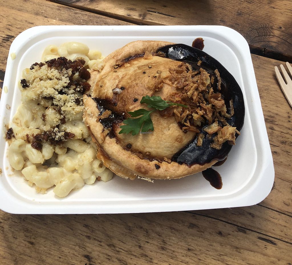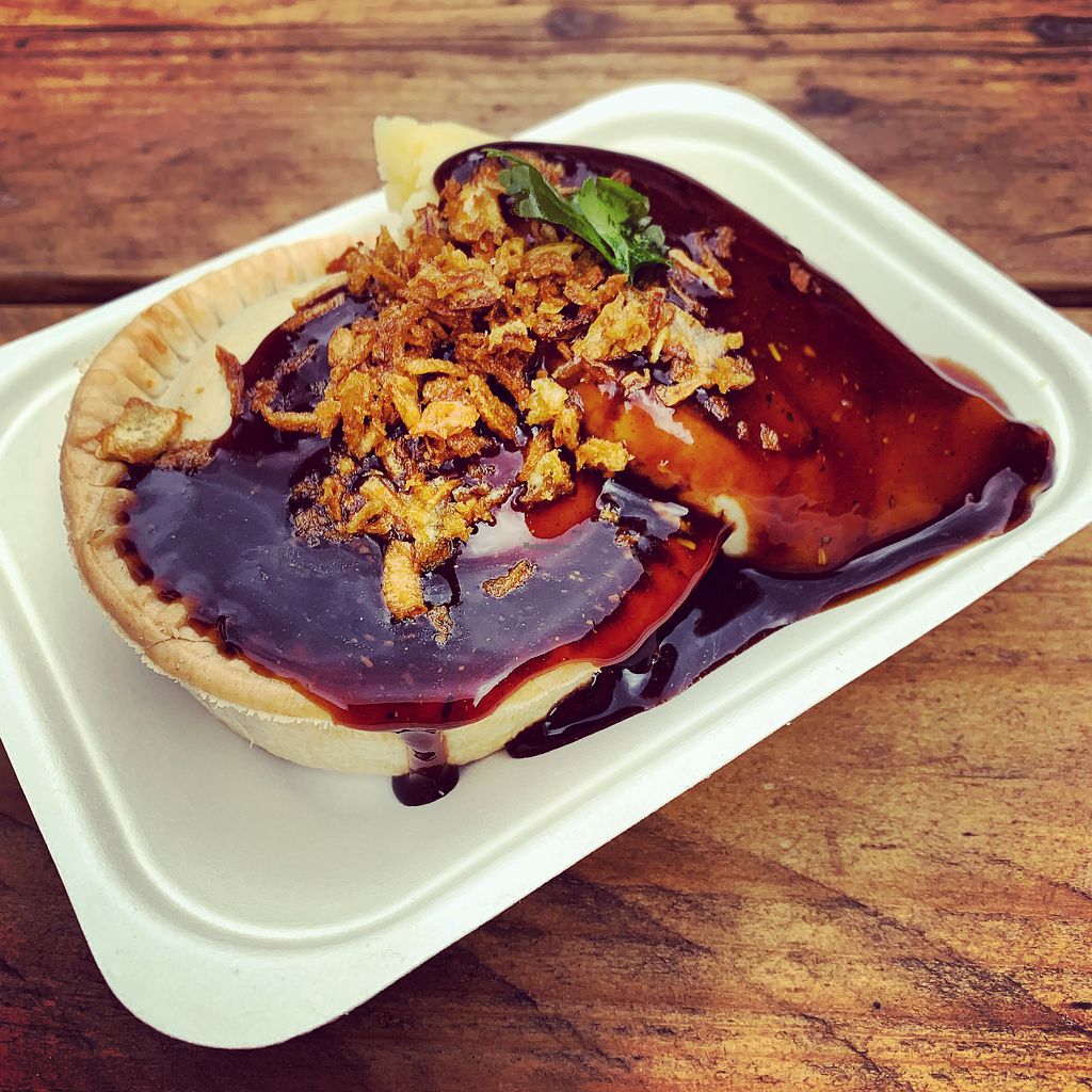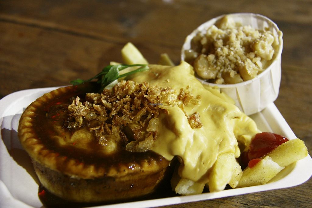 ‘Aussie’ mince pie with mashed potato, mac n cheese and gravy