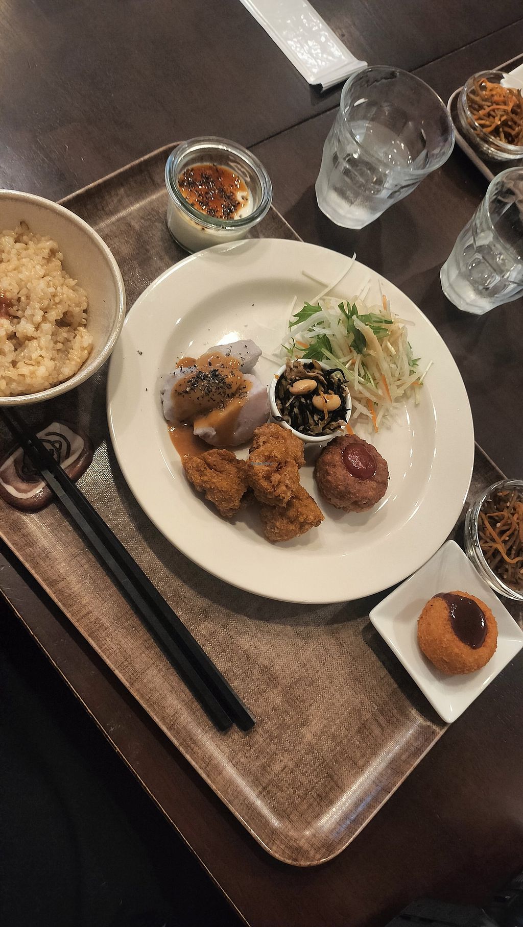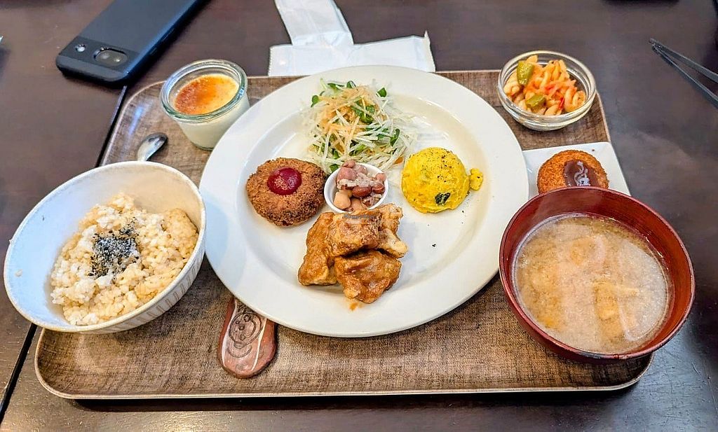 We had the lunch set and really liked it. It was a variety of smaller japanese dishes (silk tofu, different salads, soy meat karaage, croquette, miso soup, rice, ...). The meal was filling, delicious and cheap. We also had the soy ice cream. Would recommend!