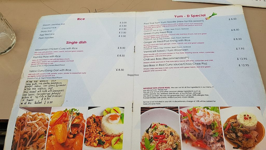 Not all that impressed with Yum-D. The menu was grubby and it didn't contain a separate veggie/vegan section. That said, most things could be made vegan with tofu.