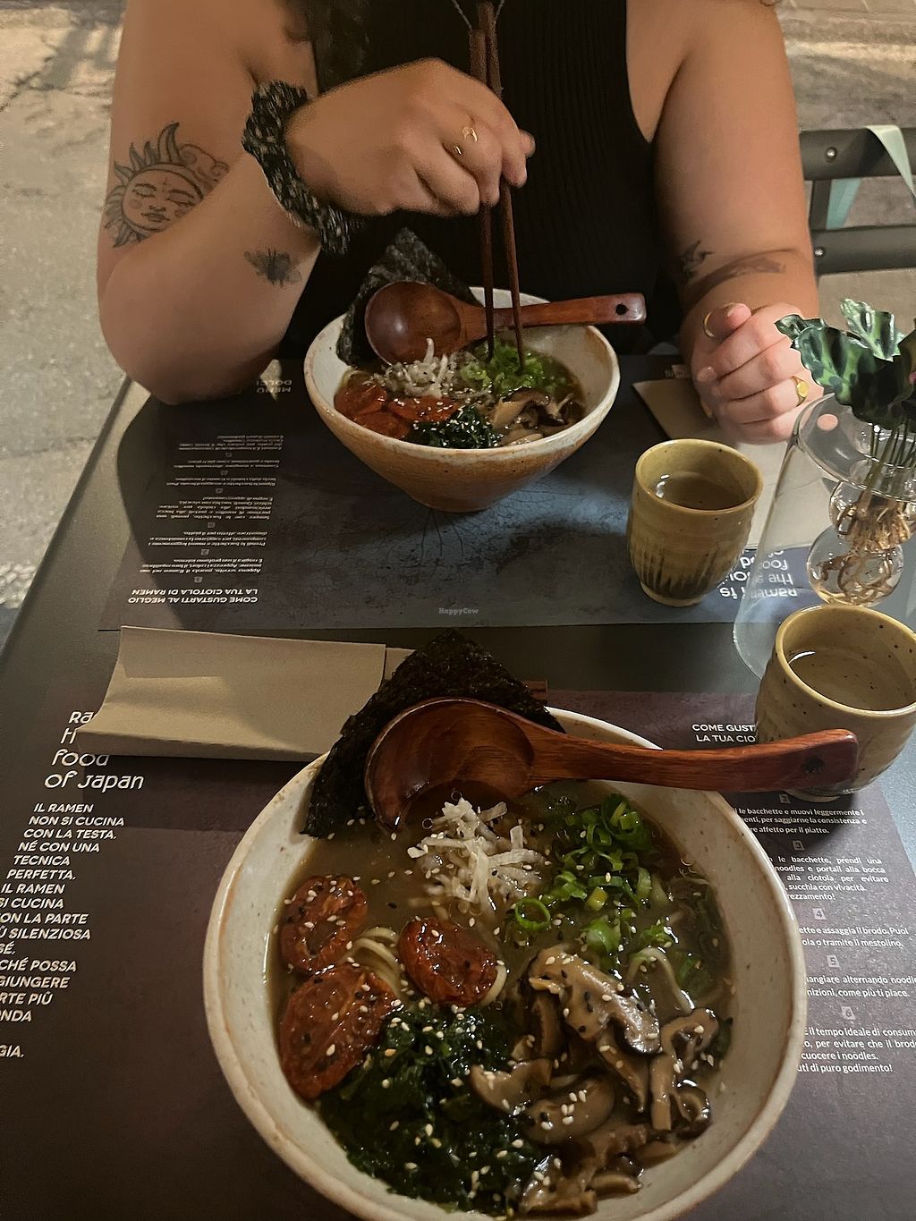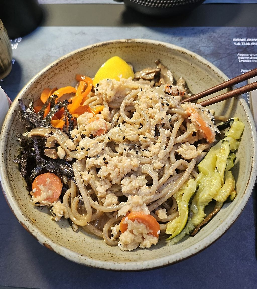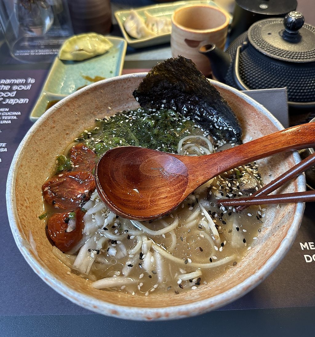 Ho preso il Kokoro Ramen vegano ‘fuori menu’, Mezesoba con soia e miso, e gyoza di verdura. Decisamente il Ramen troppo salato e quindi insapore, stessa cosa con i gyoza, che sembrano stampati in fabbrica. Mezesoba un po’ meglio.