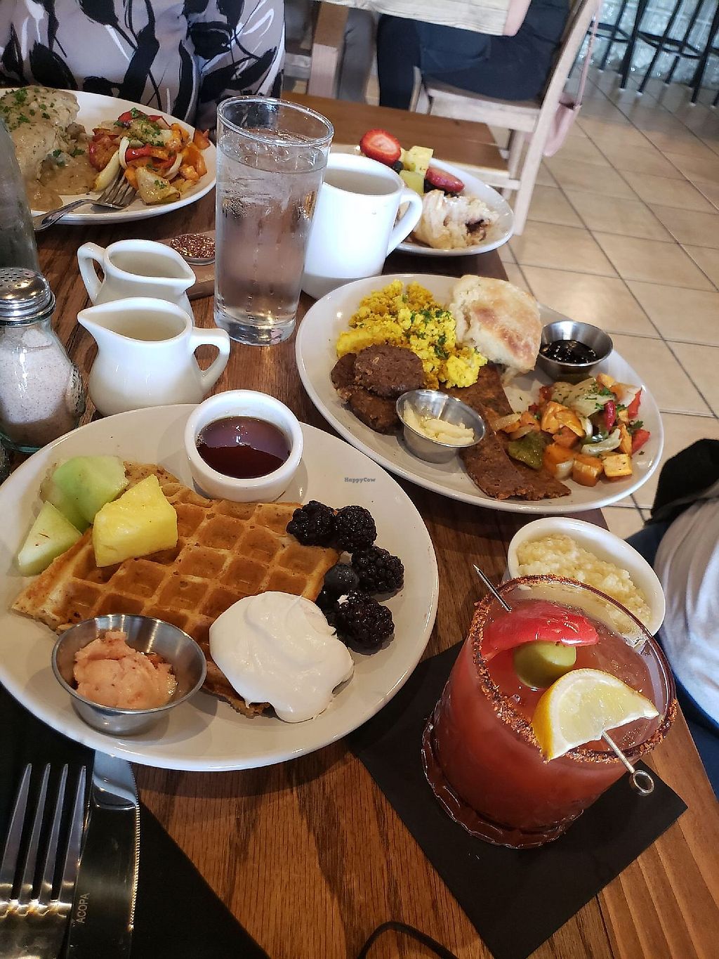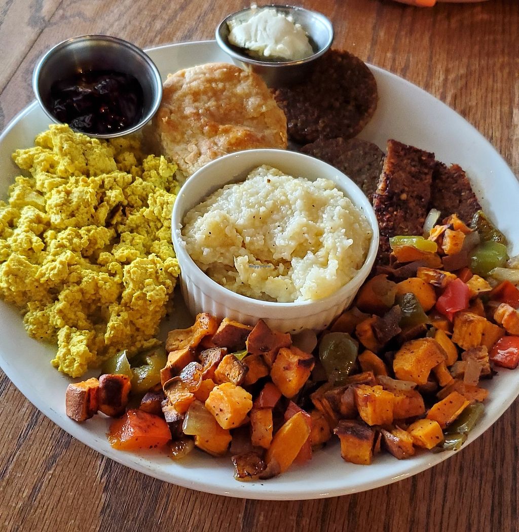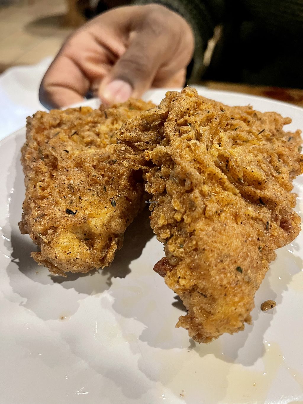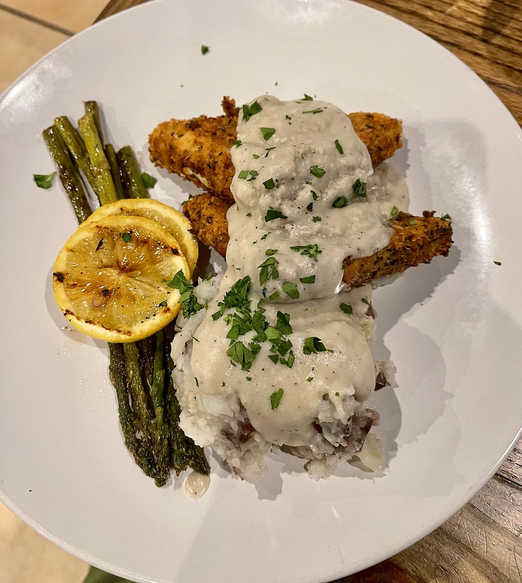 Gravy, fried chick’n, mashed potatoes, asparagus