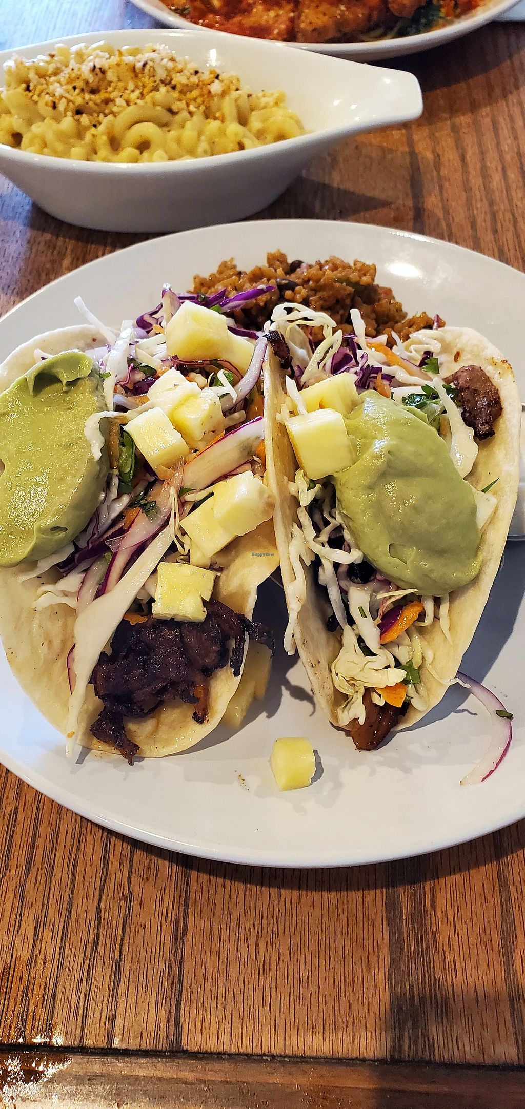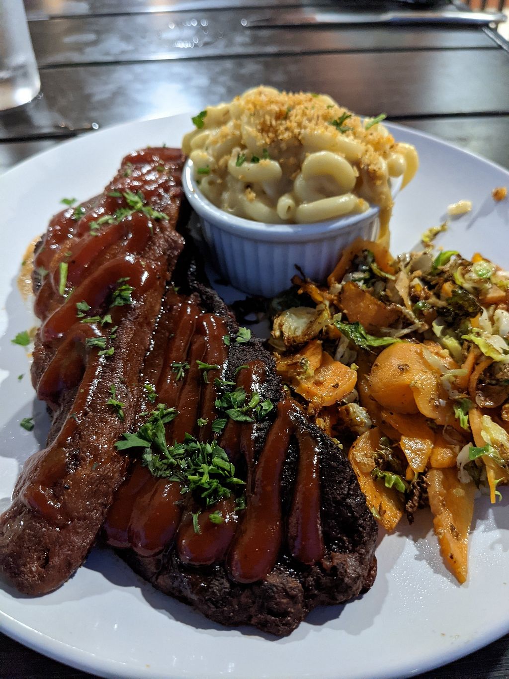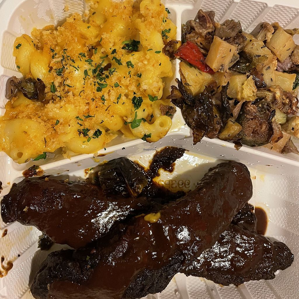 Seitan Ribs, Mac and cheese, and roasted vegetables