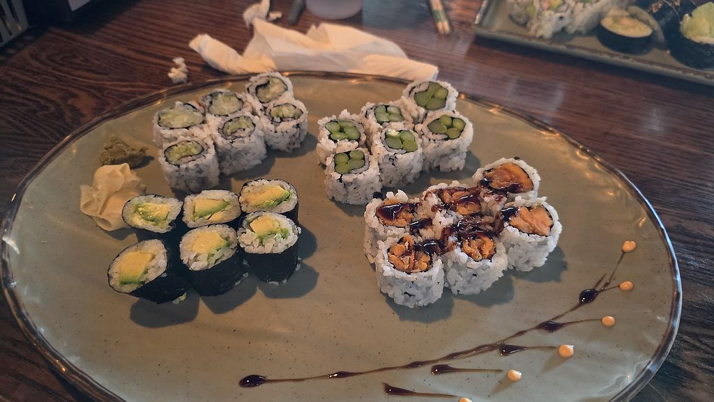 The vegetable sushi rolls are also great. Has avocado rolls, cucumber rolls, asparagus rolls, and sweet potato tempura rolls.