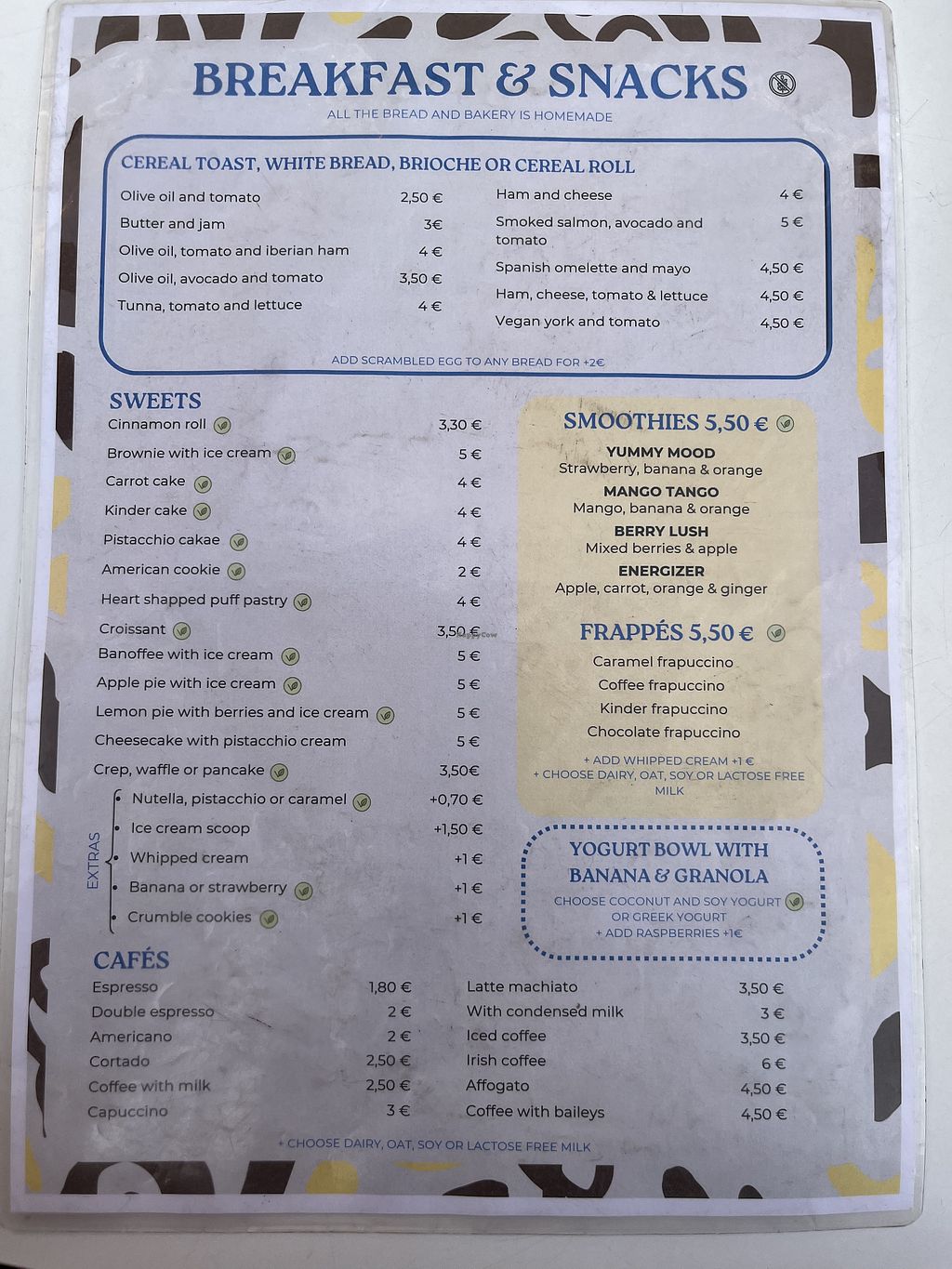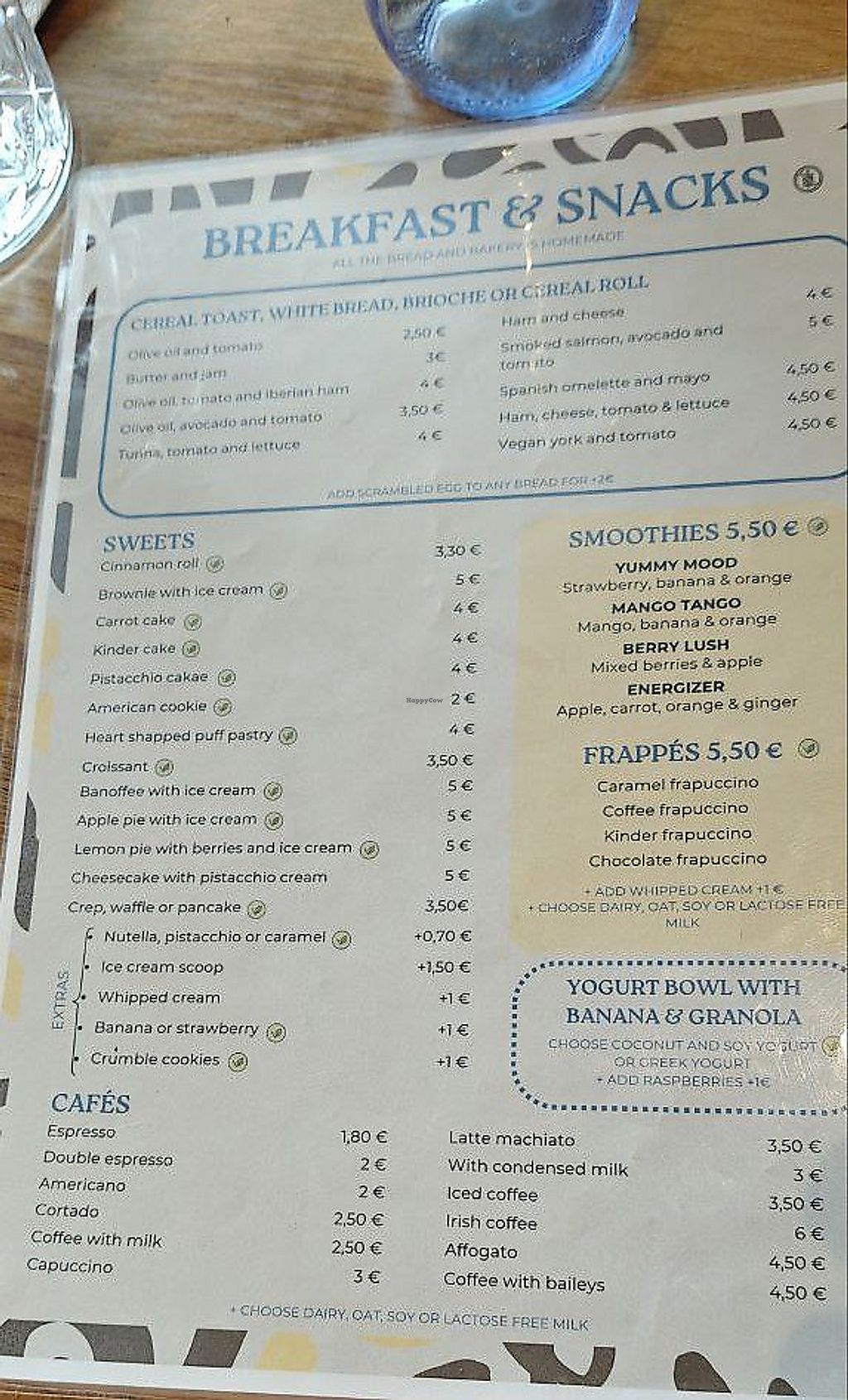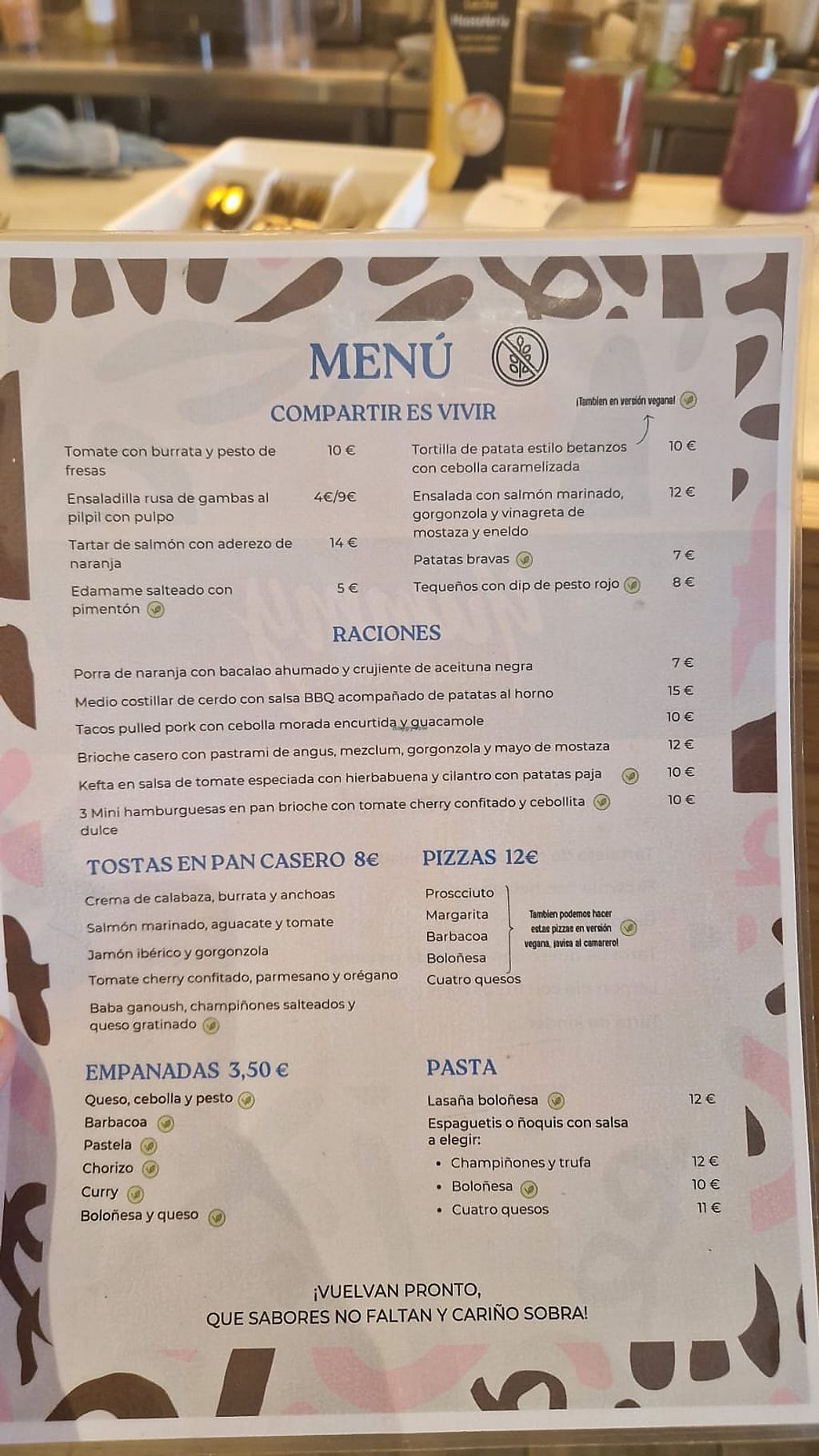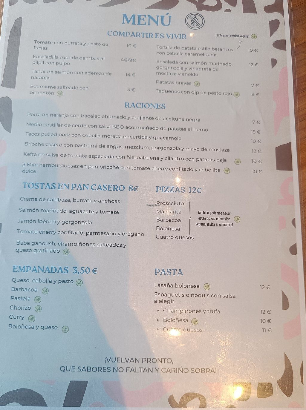 Serves meat, vegan options available. Brunch restaurant offering clearly marked vegan choices such as spaghetti bolognese, lasagna, empanadas, vegan ham & tomato sandwiches, vegan Spanish omelette, edamame with paprika, patatas bravas and desserts. Also has plant-based milk alternatives for drinks. Open Mon-Sun 08:00-23:00.