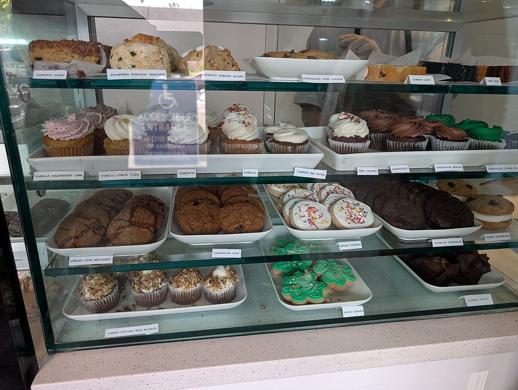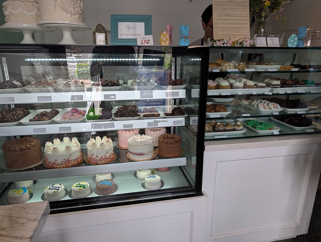 Case of cakes, cake slices and doughnuts
