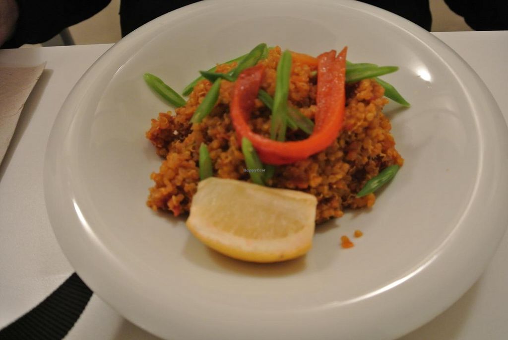 Very disappointed because we ordered the paella but it was served without seitan. At that moment we thought that we had made a mistake so we appreciate this "paella" (quinoa with small pieces of vegetables and tomatoe salsa). When we left the restaurant we took a look at the menu outside to find our mistake but it was written paella with seitan. So we went back and ask the waitress about the seitan who answered us that it was "paella quinoa", then the man took part and told us it was with seitan. So i told him that i was used to cook seitan at home but i didn't notice the seitan in his paella, he insisted and told me it was small pieces in the salsa.