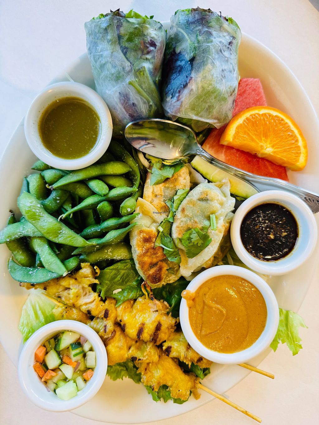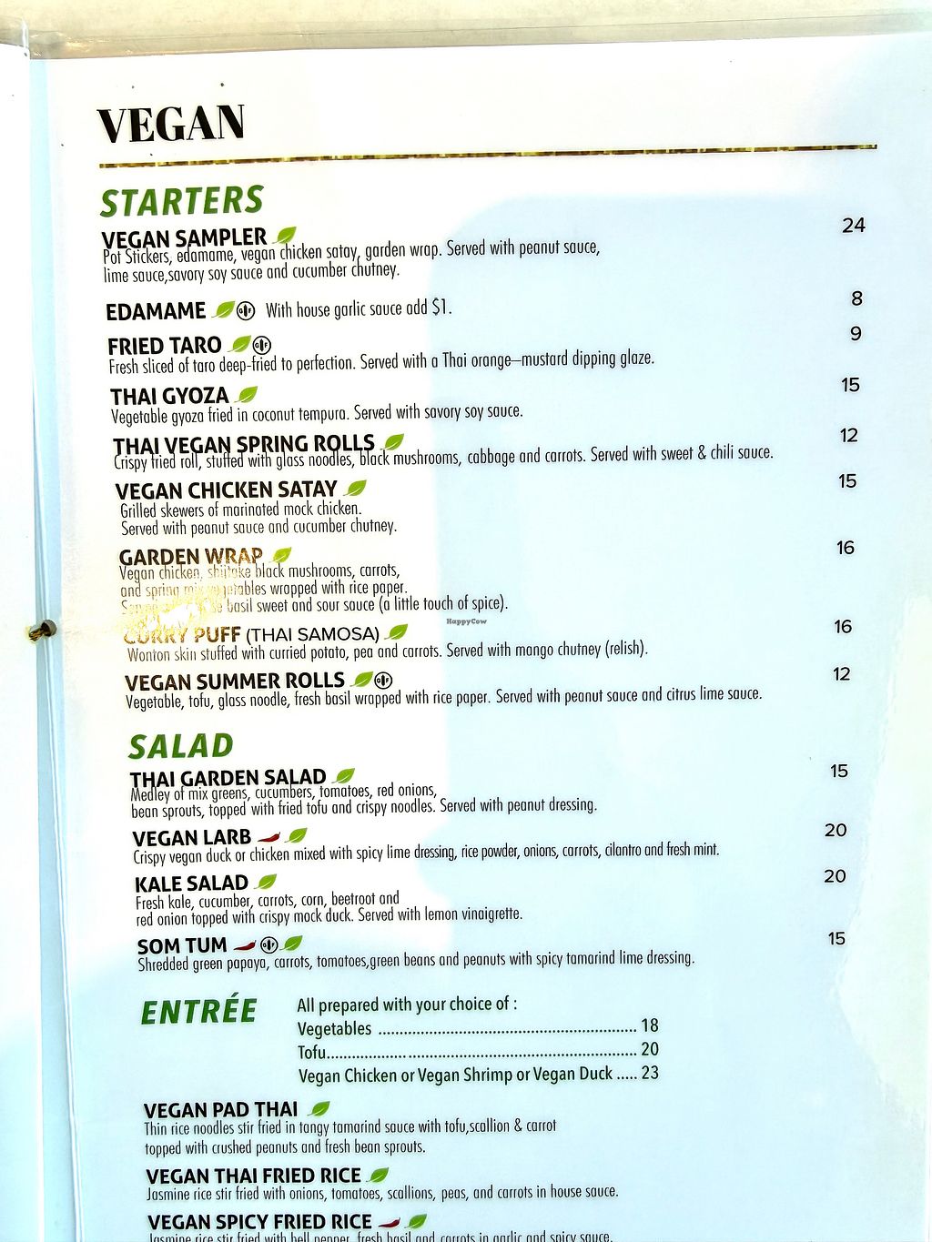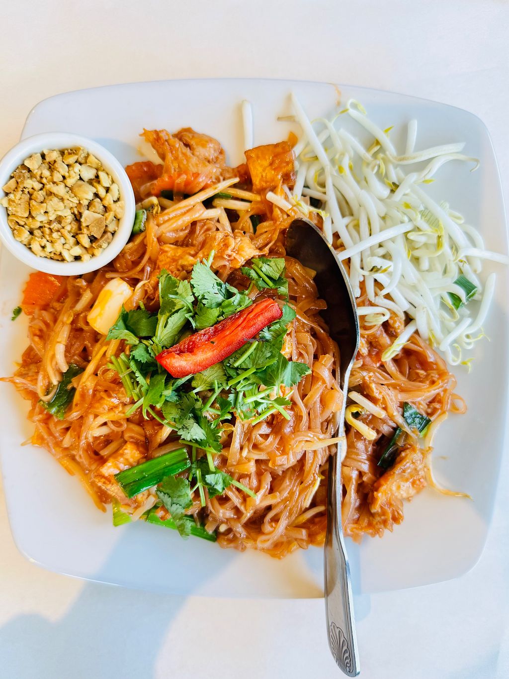 Vegan duck and veggie glass noodles dish with a vegan Thai iced tea!