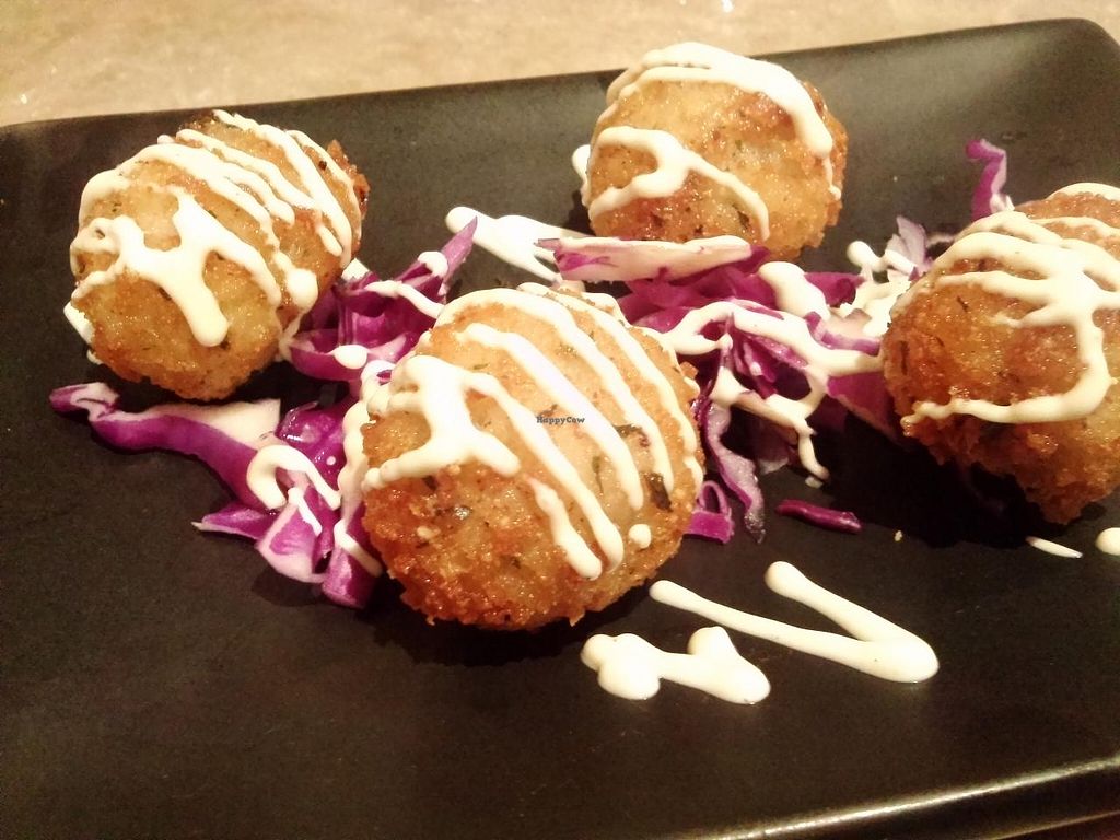 Falafel di ceci, verza rossa, pane al carbone vegetale e salsa tzaziki