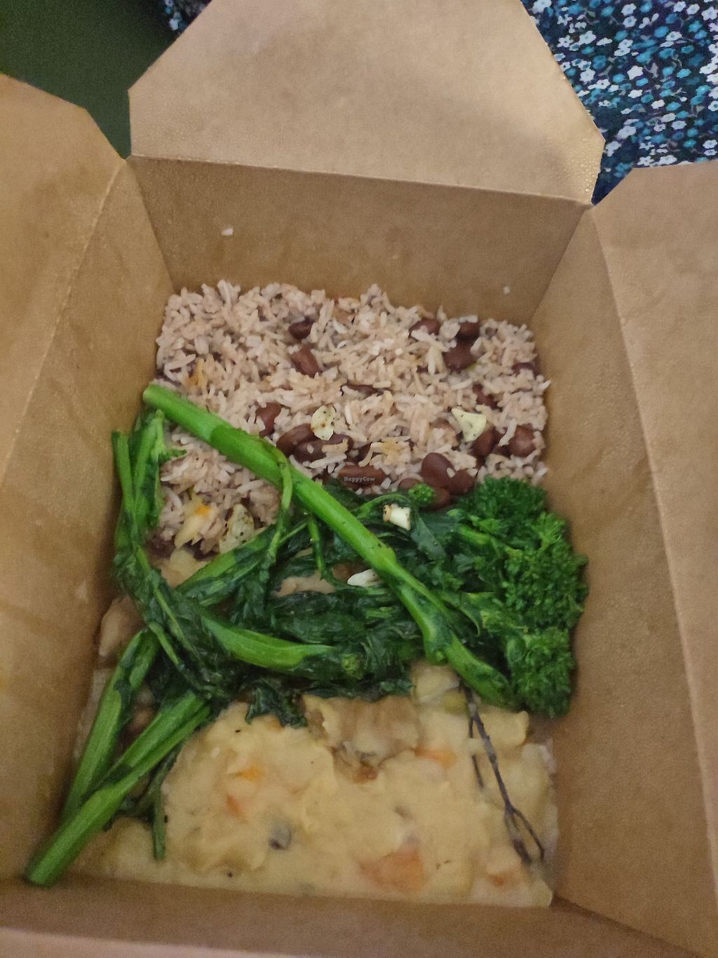 We really enjoyed the vegan curry goat and falafel sandwich. The seating area has trees and is very nice.