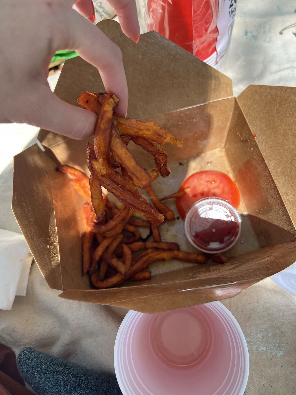 We had a really rough experience here today. Found out it’s not all vegan - they use a patty with egg & milk & the service was not great. We waited for our food to take to the park and the worker behind the bar was watching videos on his phone at full volume and left his phone on the bar playing a video on a loop of the same video for a full 10 mins. It got to be so ridiculous. No toilet paper in bathroom, no air conditioning inside, and then the food was not good.