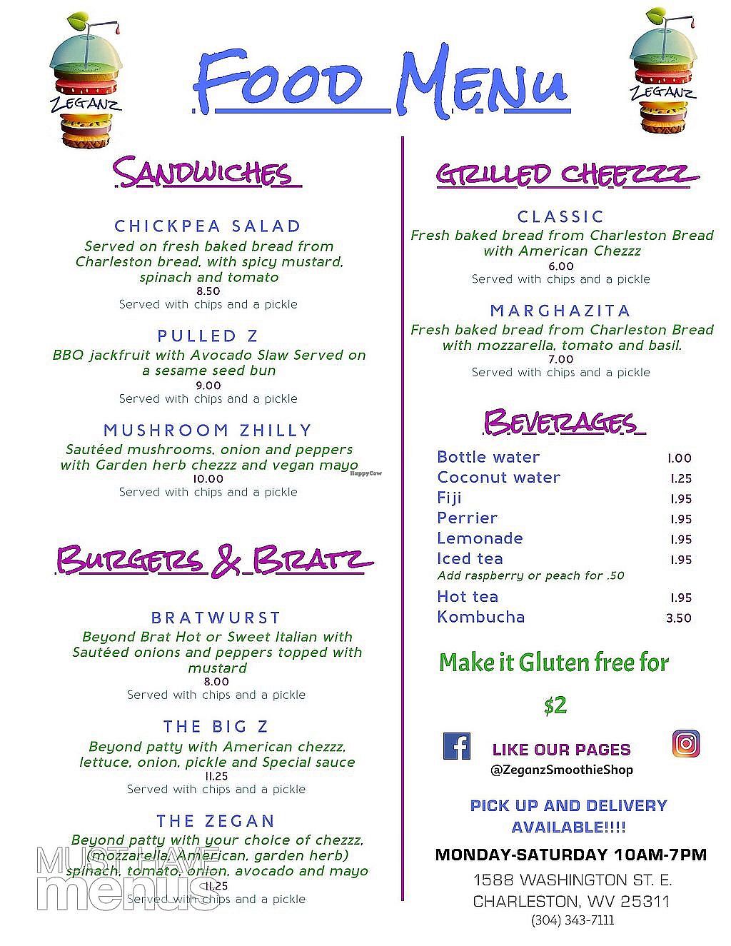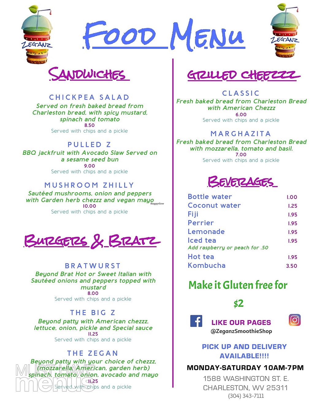 I’ve attached photos of the menu and the chickpea salad sandwich, the Zegan (with gluten free bread), double chocolate chunk cookie, the Pez smoothie, and the Strawberry Bonanza smoothie. My favorite is the chickpea salad :)