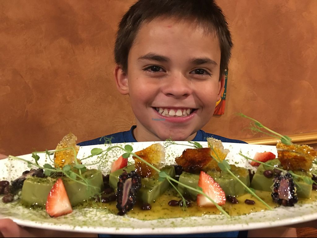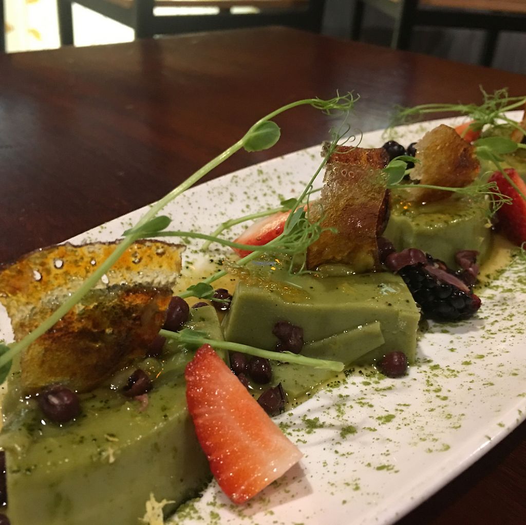 Matcha soy creme brulee, adsuki beans, berries , pea shoots