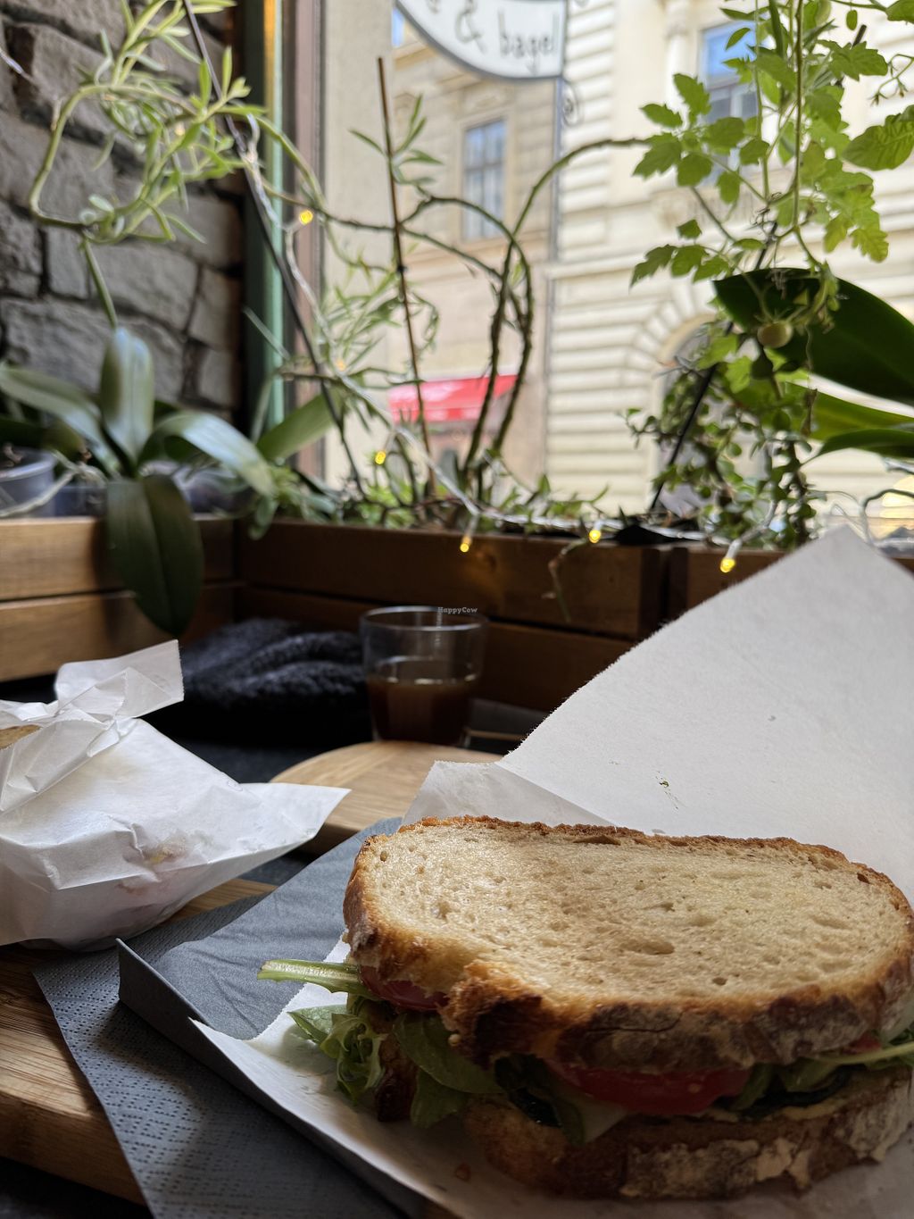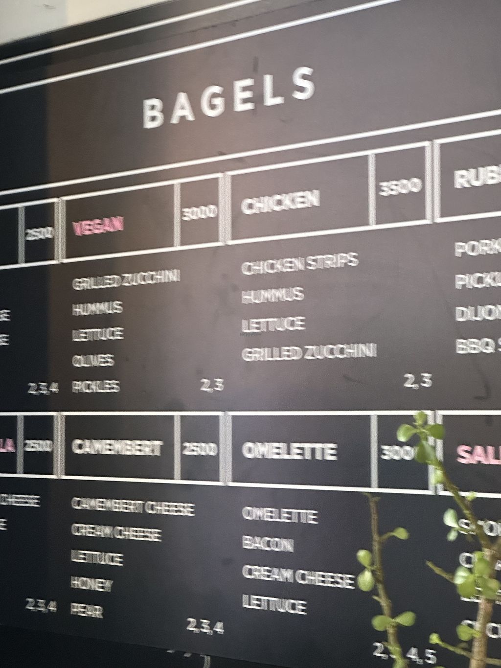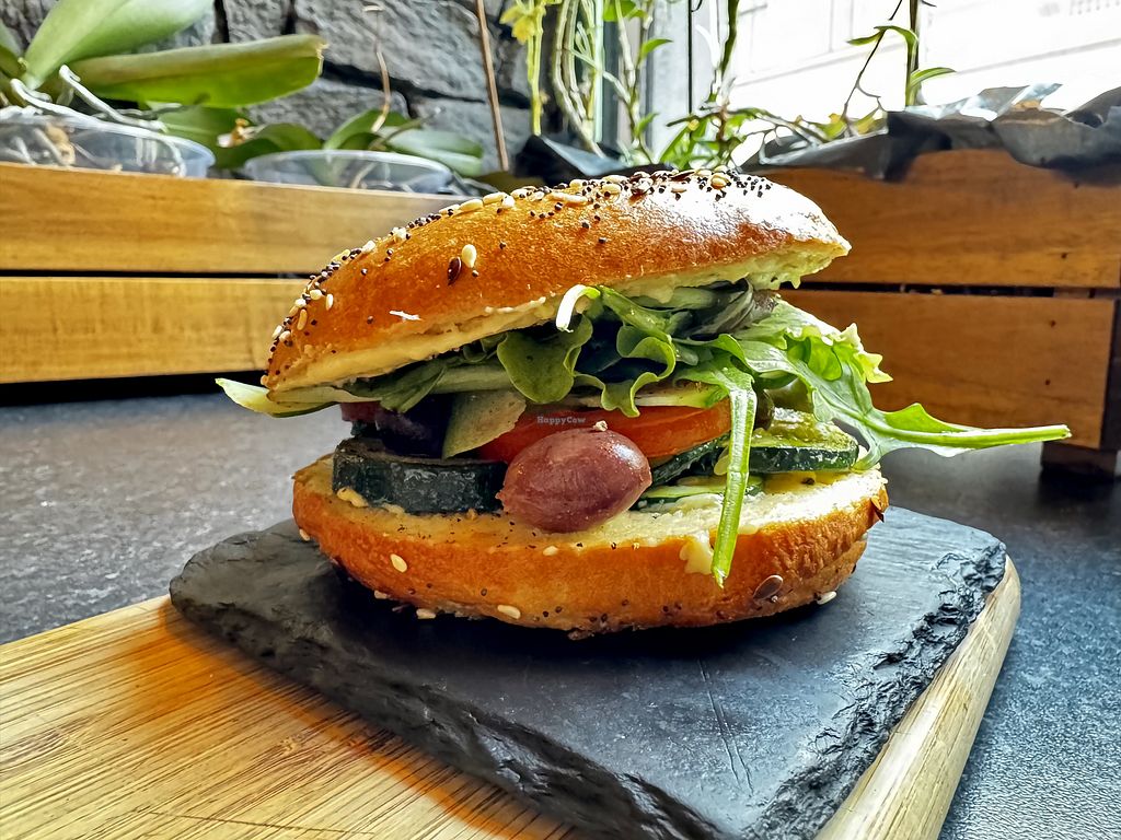 Vegan bagel with grilled zucchini, hummus, lettuce, olives and pickles