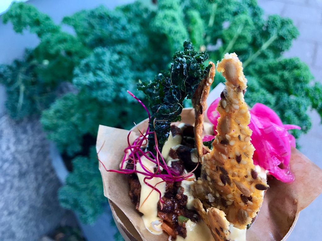 Vegan black beans, avocado cream, mango salsa, gluten free home made s…