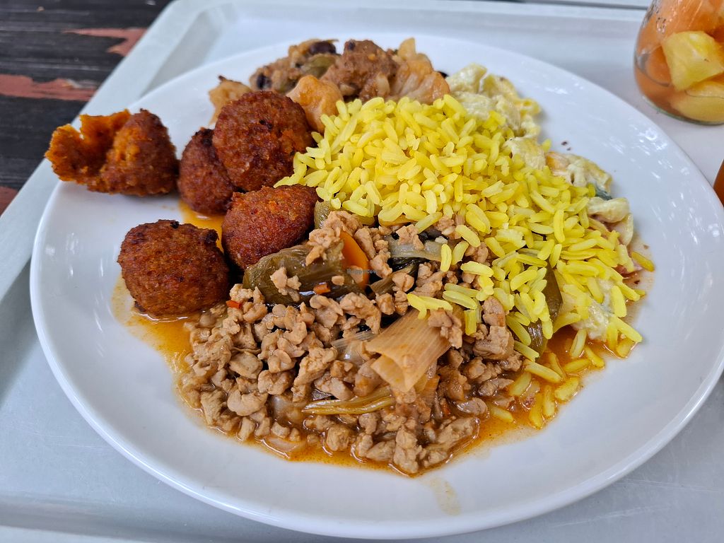 Leckere vegane Optionen am Buffet. Im Innenhof ist es sehr schön. Es lohnt sich definitiv auch als nicht-Student, hier hinzugehen.