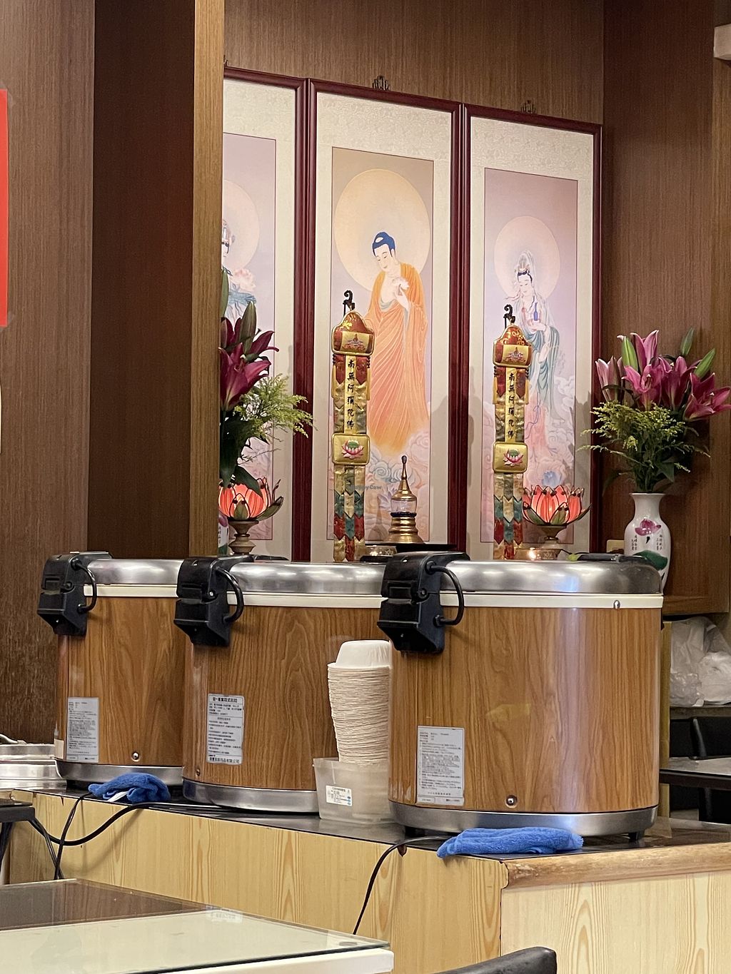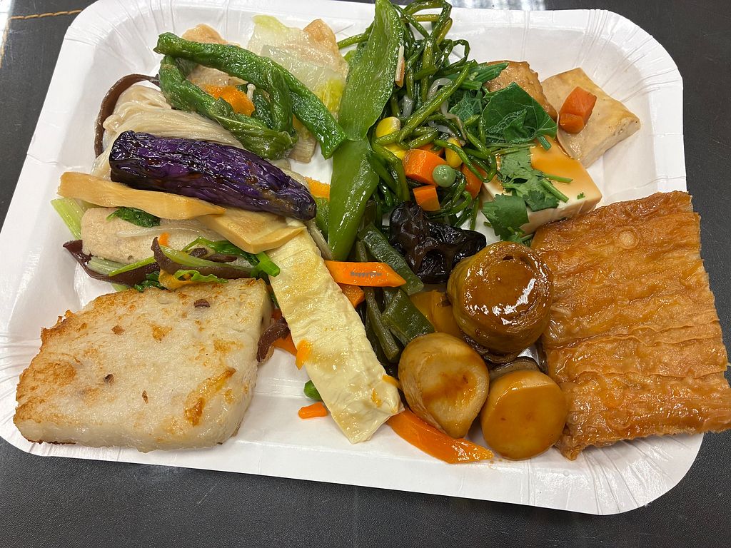 Pick up a tongs, a plate (there’s also takeaway plates, with lids), and knock yourself out. So many choices, my eyes bigger than my stomach. Lots of vegetable choices, chick peas, tofus, fake meats, some cooked healthily, some fried, some fermented. They have sweets too. The rice station is just past the pay station. Pay by weight, and it’s very affordable.