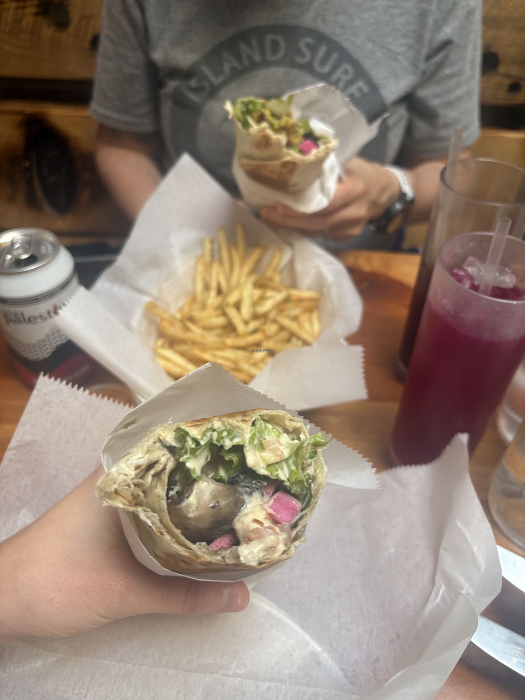 Falafel wrap, fries, vegan dip, and rose lemonade