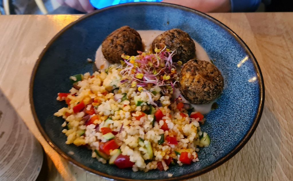 Buckwheat “meatballs” with pumpkin hummus and salad