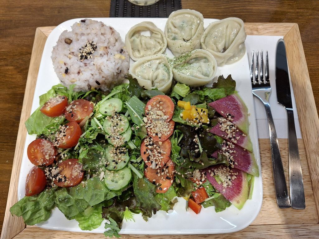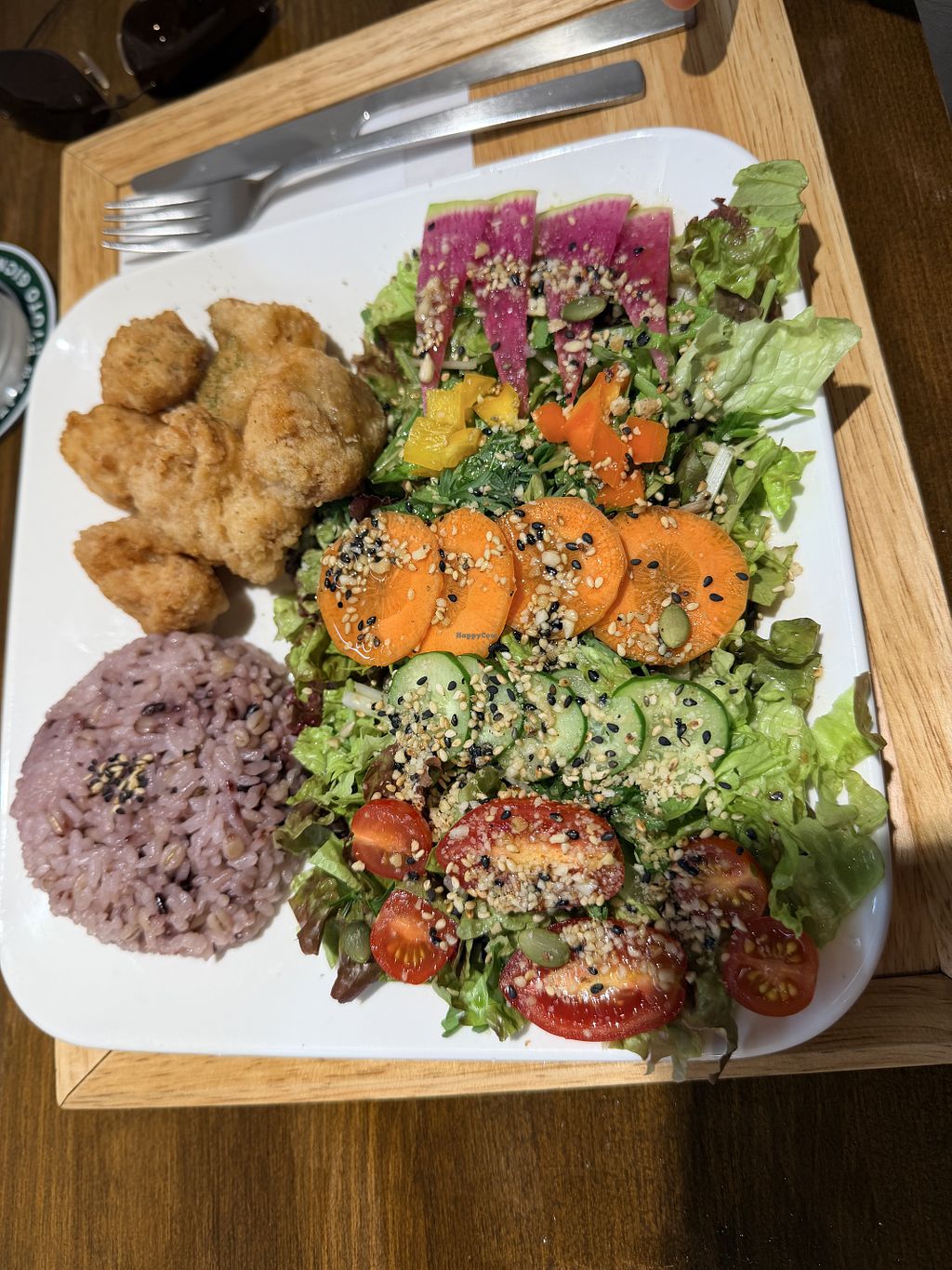 Really tasty vegan meal, we had the hamburg steak and soy cream in hamburg meals, which were super. The texture of the burgers was amazing and the side salad was really good too. The staff is really happy and friendly and interested in the customers. Really good atmosphere.