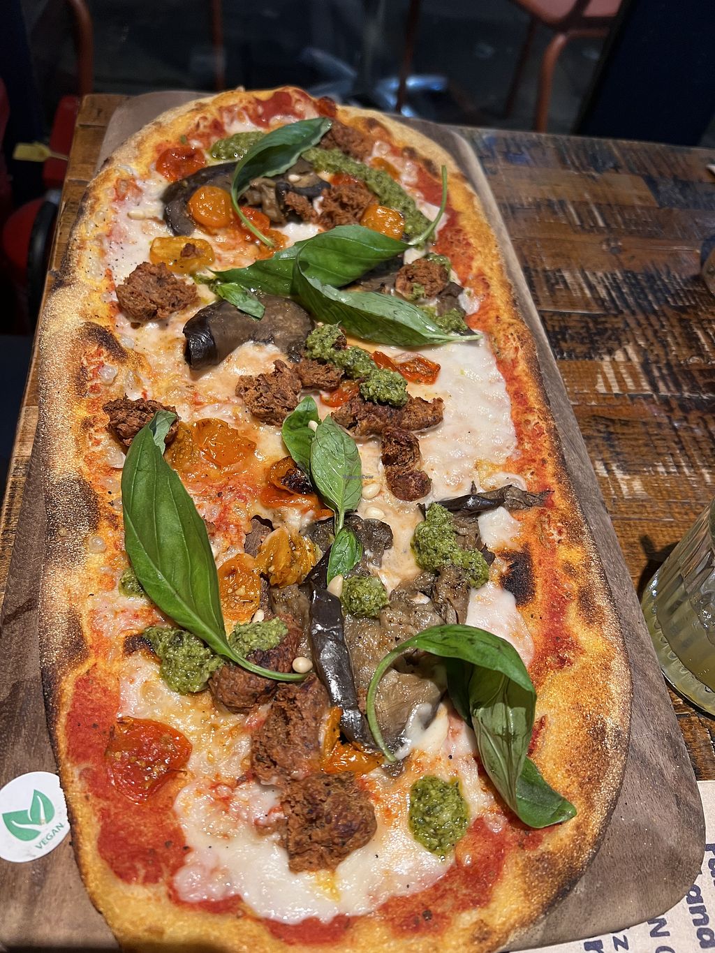 Vegan Rustica Pizza with vegan n’duja, vegan pesto and aubergine