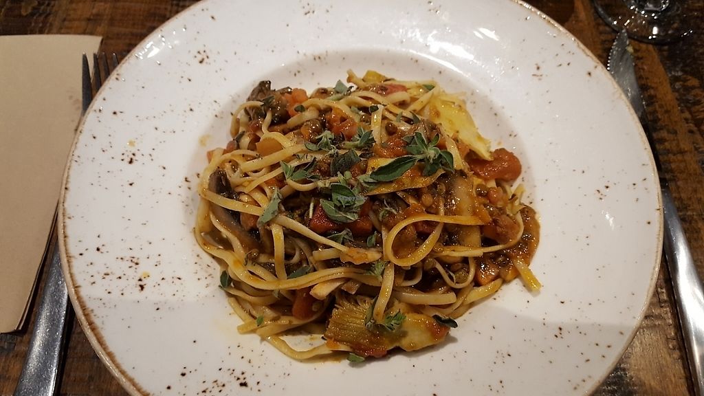 Vegan lentil ragu pasta with artichokes, mushrooms and Pine nuts