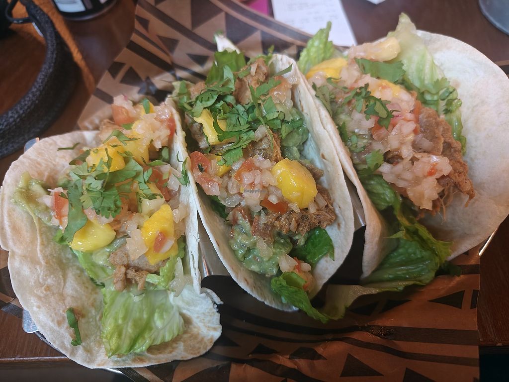 Vegan mango tacos with pulled jackfruit.