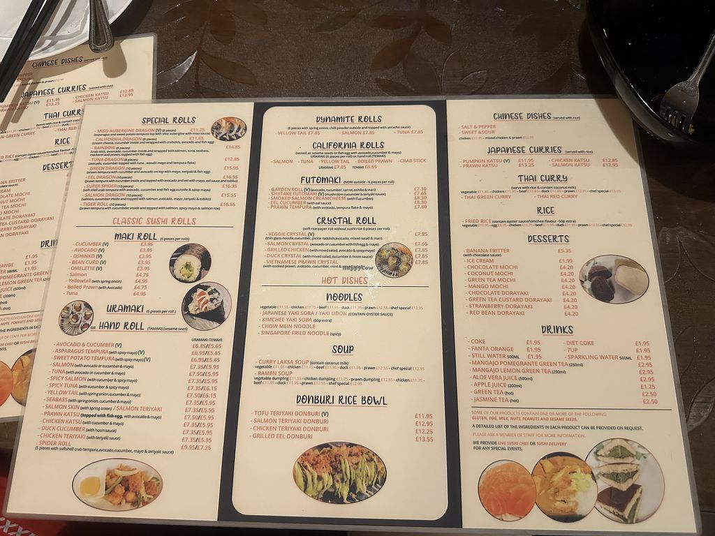 Serves meat, vegan options available. Offers Japanese, Thai, and Chinese cuisine with vegan choices such as cucumber, avocado, oshinko, or bean curd maki rolls, sweet potato tempura, vegetable udon or yakisoba noodles, vegetable Singapore fried rice or noodles, vegetable dumplings (gyoza), garden roll, shiitake futomaki sushi, veggie crystal roll, ramen soup, and tofu teriyaki rice donburi. Open Mon 13:00-22:00, Tue-Fri 17:00-22:00, Sat 15:00-22:00, Sun 13:00-22:00.