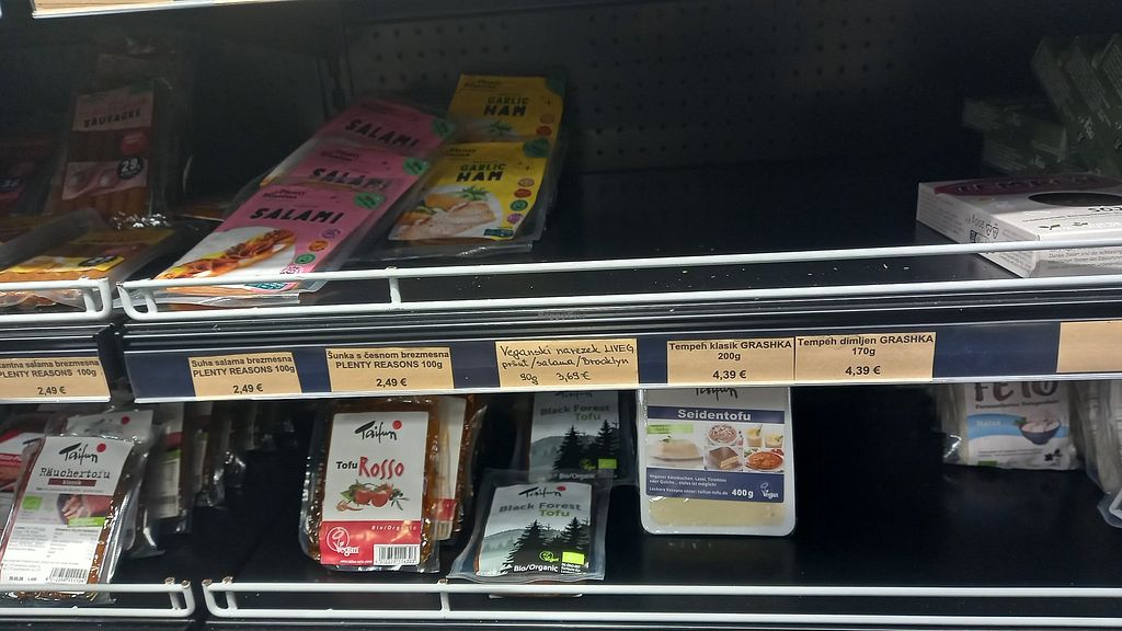 They sell items by the Veganka brand like Škuta (vegan cottage cheese) and their desserts.