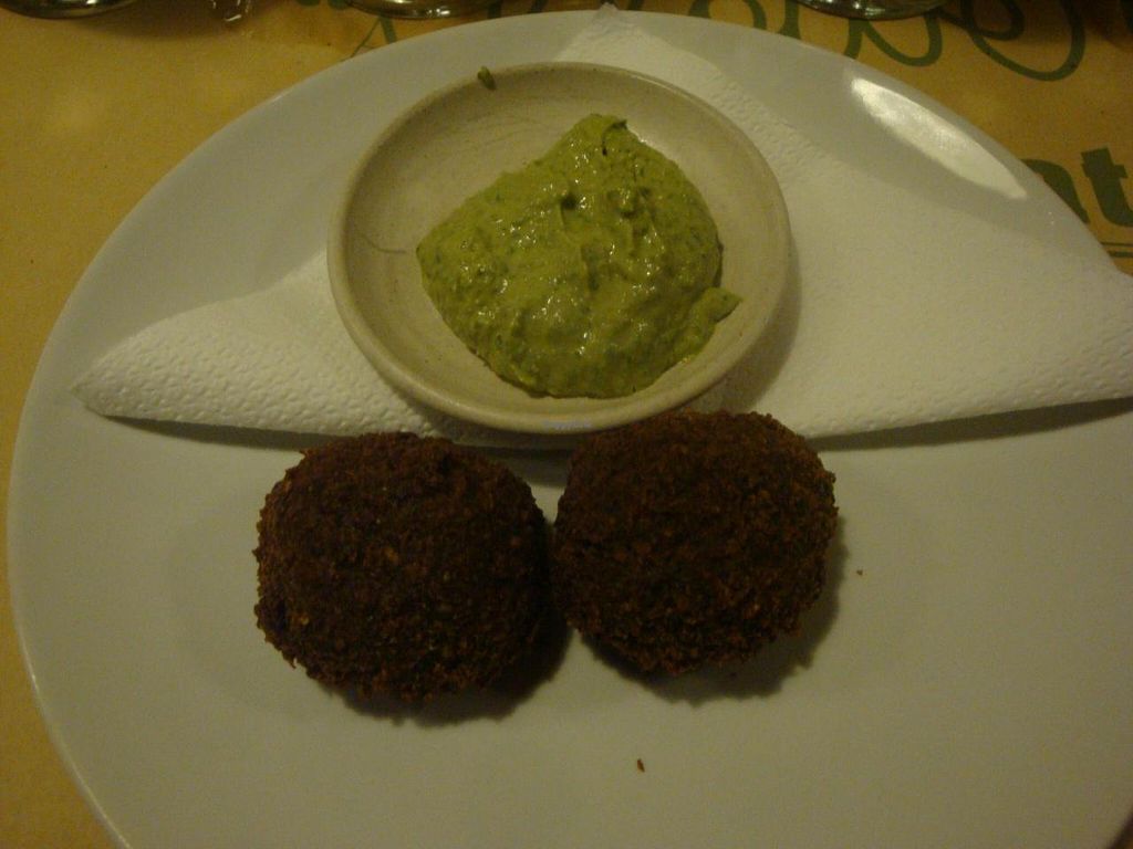 Runny hummus, runny baba, runny tomato whatever it was, the falafel balls were rock hard and dry.