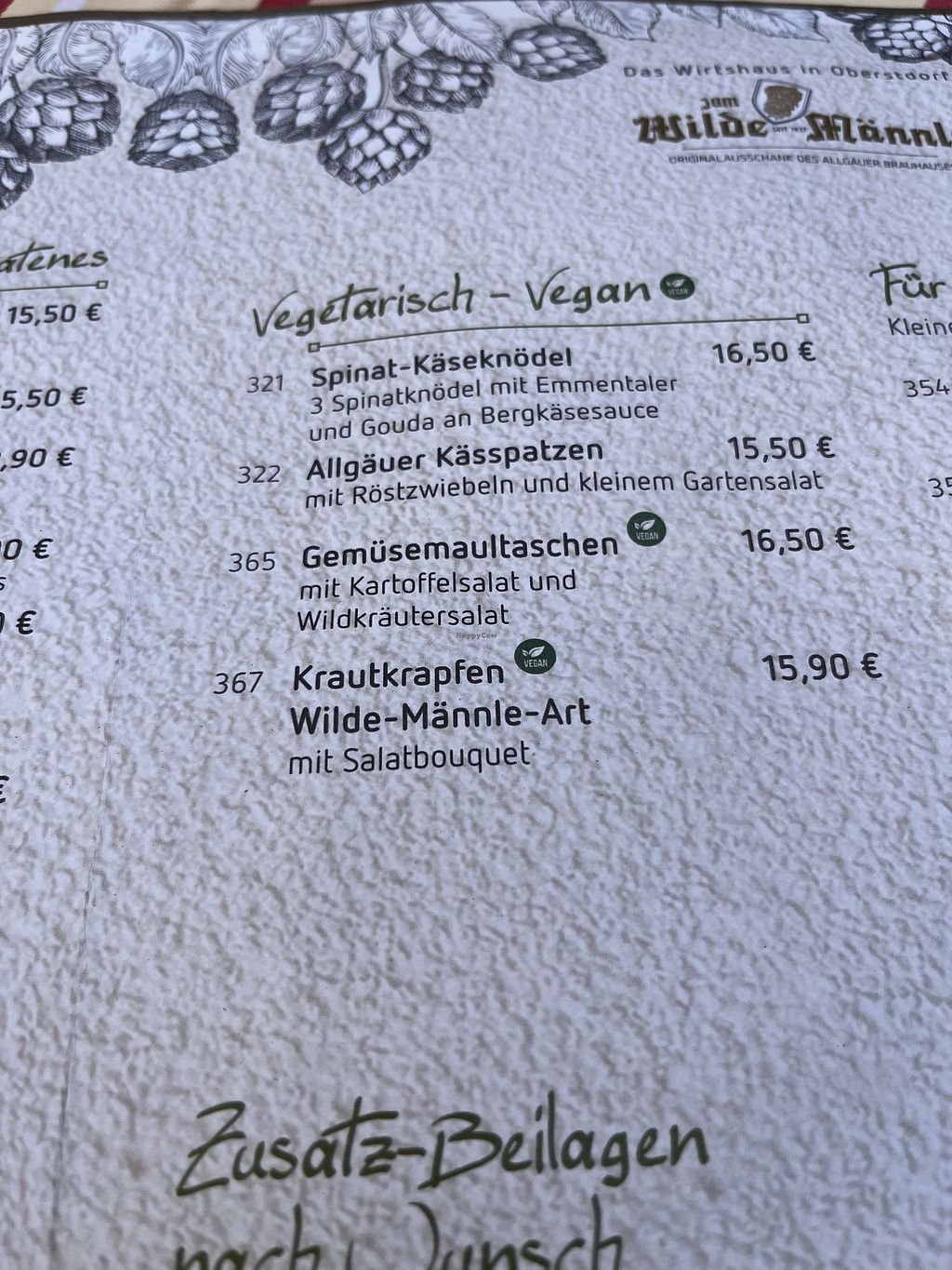 The vegan/vegetarian section in the menu has been narrowed down to 5-6 dishes of which only one is vegan: Spinat Maultaschen und Kartoffelsalat. The food was delicious though! I hope they will have more vegan options soon again!