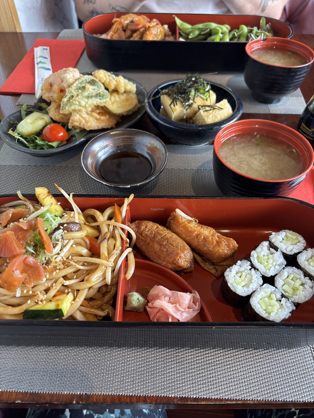 We ate from the Lunch menu & had a bento box each which came with a tofu/vegetable noodle dish, several sushi rolls, a couple of tofu pockets, and miso soup