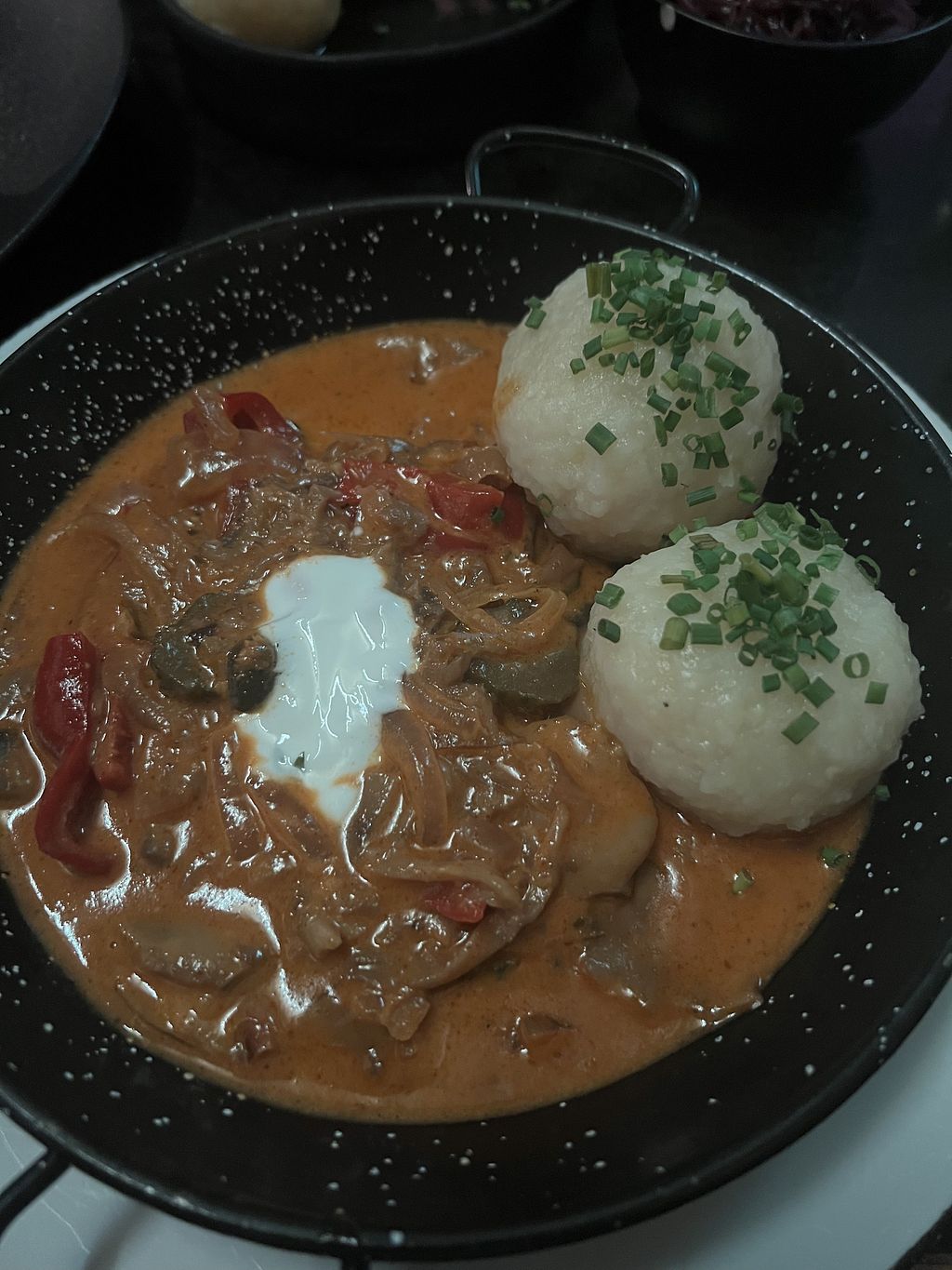 Sehr fein abgestimmtes veganes Gansl begleitet von Erdäpfelknödeln, Rotkraut und wahlweise im Menü mit Suppe als Vorspeise und Maronicreme als Nachspeise. Liebes Personal, dynamische Location, draußen sitzen möglich! Hab schon mehrfach Vegansl probiert und mochte es nie wirklich, aber hier wurde ich positiv überrascht, geschmacklich nicht altbacken, und langweilig und ganz klar ersichtlich, dass es sich nicht um Fleisch handelt (manchmal brauch ich das wegen Trust issues) checke allerdings nicht, wenn man so einen köstlichen Kollegen auf pilzbasis basteln kann, wieso eins dann noch echtes Fleisch anbieten muss, aber naja