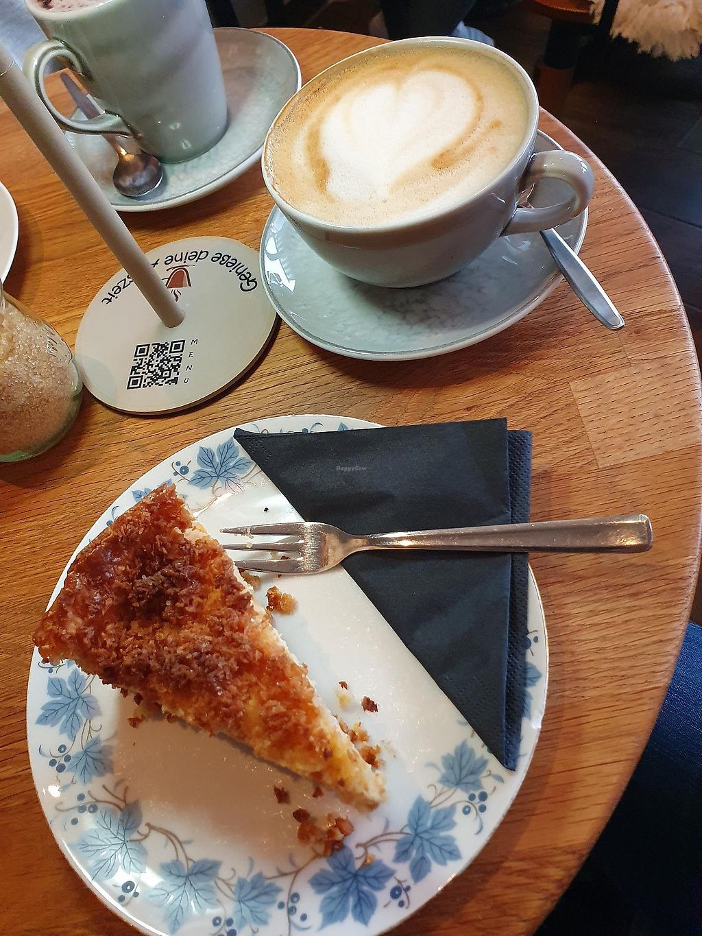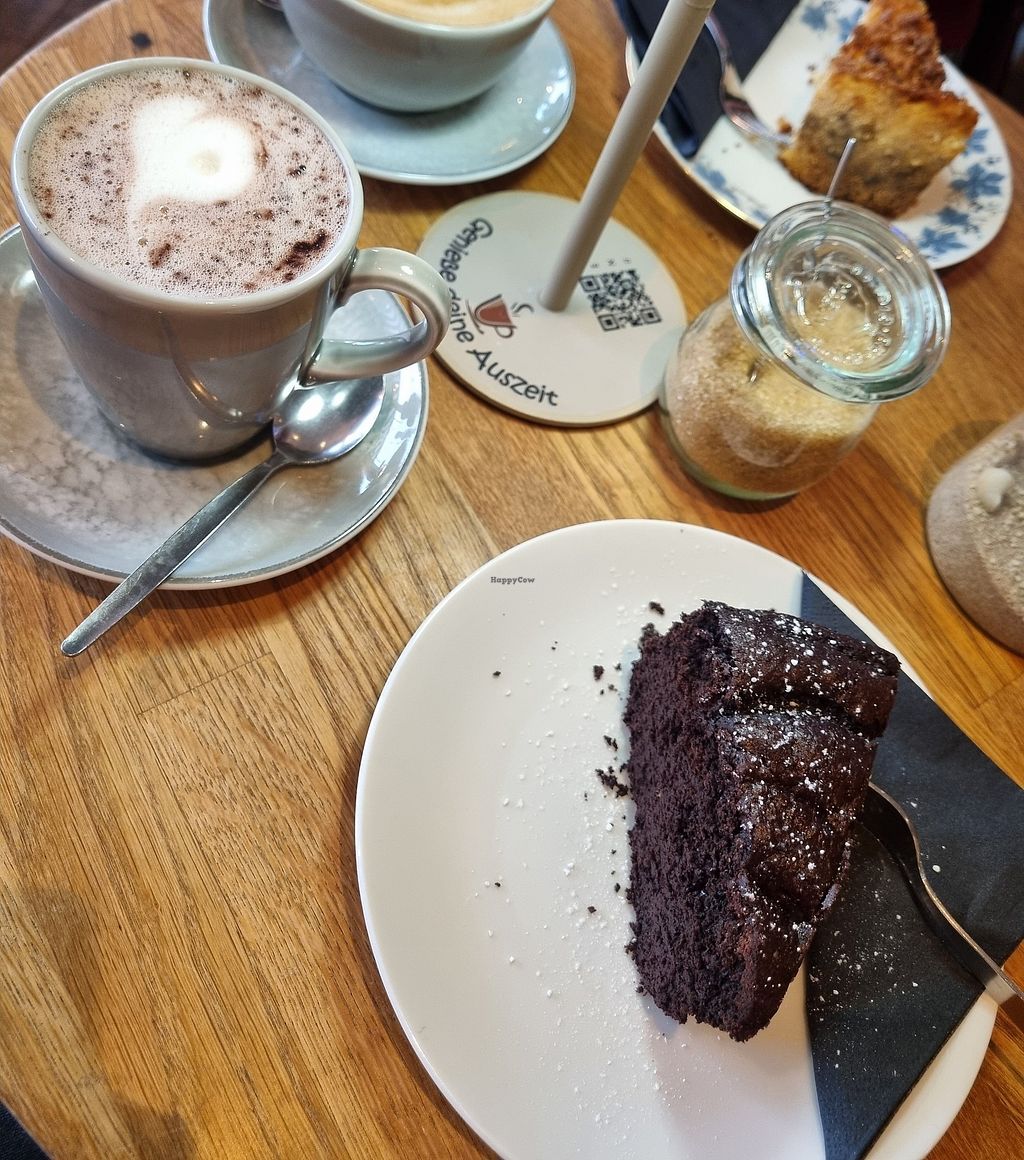 Really cozy café with different vegan options, both savoury (pinsa) and sweet (pancakes and porridge on the breakfast menu, cake). We had a mandarin-coconut cake and chocolate cake. First, we got non-vegan cookies with our hot drinks, but after asking whether they are vegan, we returned them and they brought us vegan Lotus cookies! Really nice service.